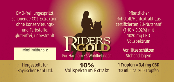 CBD auch für den Reiter, denn wer kennt es nicht, raus aus dem Alltag und schnell zum Pferd. Da ist man nicht immer ruhig und ausgeglichen und unsere sensiblen Pferde reagieren prompt darauf. Deshalb sind ein paar Tropfen hochwertiges Ridersgold mit 10 % CBD oft sinnvoll für eine harmonische und ...